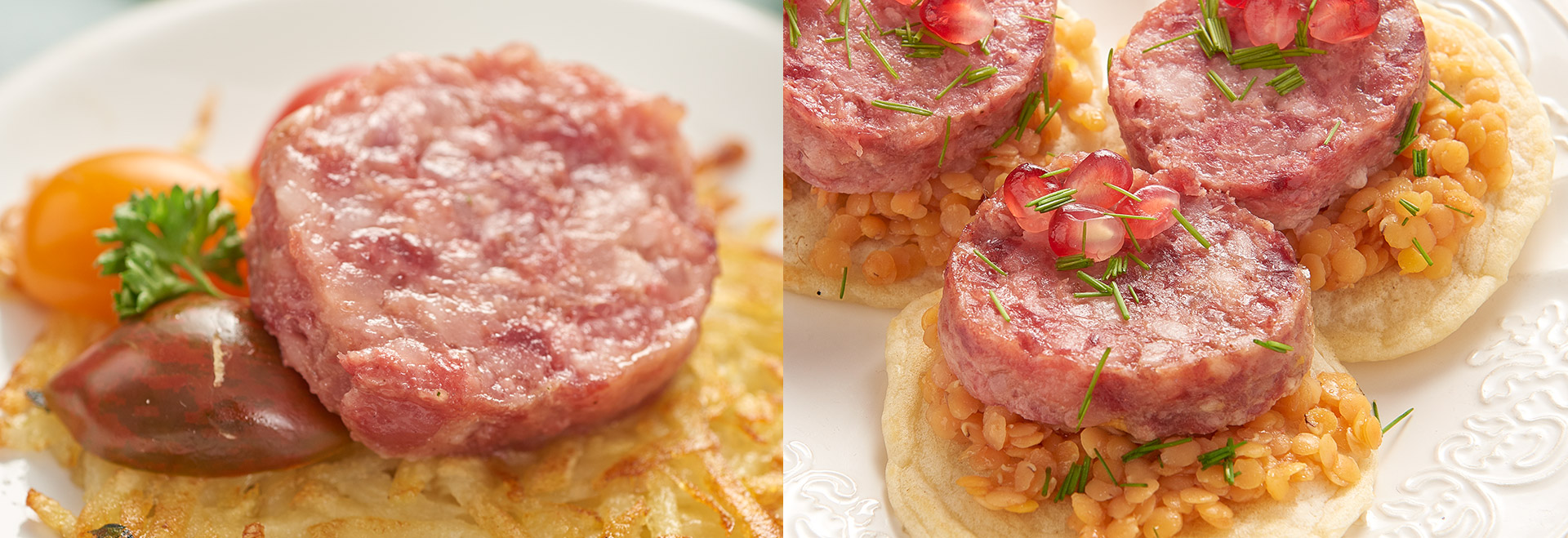 Then the mixture obtained is stuffed into a natural casing, represented by the skin of the pig’s front leg. The pre-cooked product is packed in hermetically sealed bags and subjected to heat treatment at elevated temperatures for a sufficient amount of time to ensure organoleptic stability.