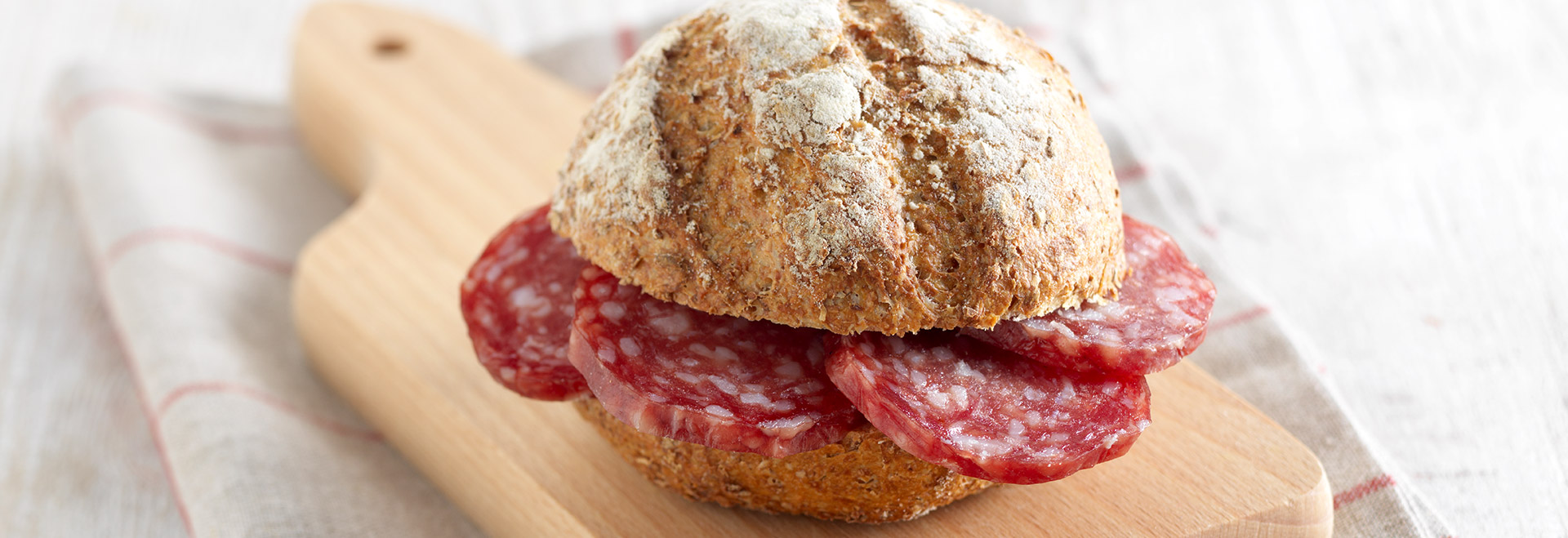 サラミーニ・イタリアーニ・アッラ・カッチャトーラDOP は、粒状のラードが均一に広がり、ルビーレッドの色合いが特徴的な小ぶりの風味づけされたサラミです。古くからの伝統を尊重し、使用する材料は高品質の豚のカット肉、塩、胡椒、ひとつまみのニンニクのみ。質の高い豚肉はプレートとナイフが連なった機械で細かく切り刻まれます。その後、こねと腸詰め、味付けが行われます。